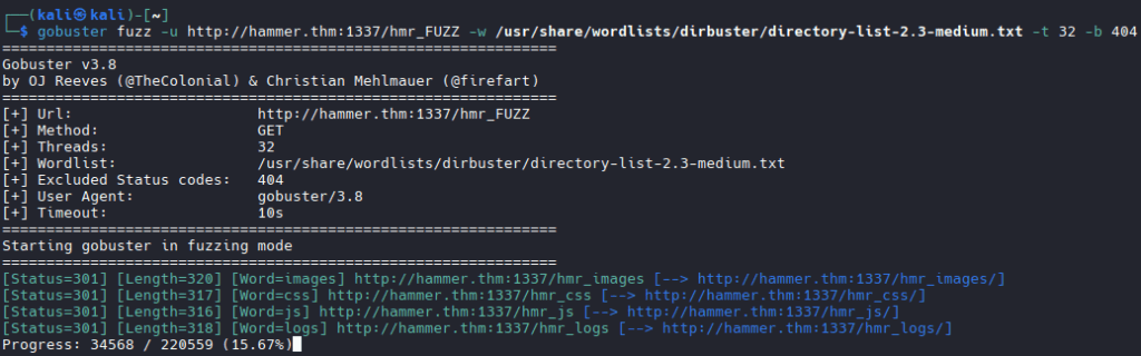 gobuster fuzz -u http://hammer.thm:1337/hmr_FUZZ -w /usr/share/wordlists/dirbuster/directory-list-2.3-medium.txt -t 32 -b 404