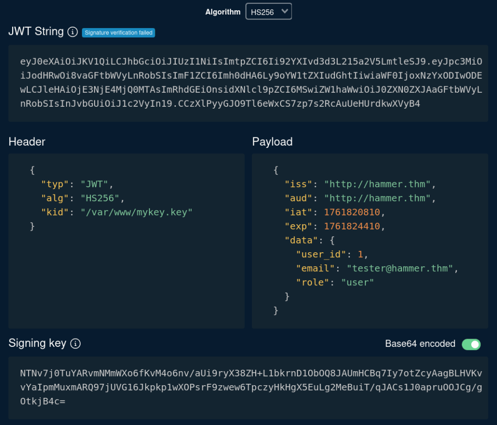 However, we have another key: 188ade1.key. That file is exactly 32 bytes (256 bits), and this is the length of the HS256 signature. We need to encode it with Base64 and ask token.dev to use it to sign the new payload. Do not forget to update the kid value with the path to our signing key.