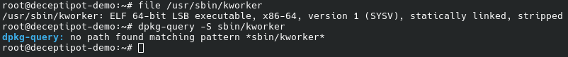 This confirms that kworker was planted by the attacker. We can then use md5sum to get the binary’s MD5 hash and answer the fifth question.