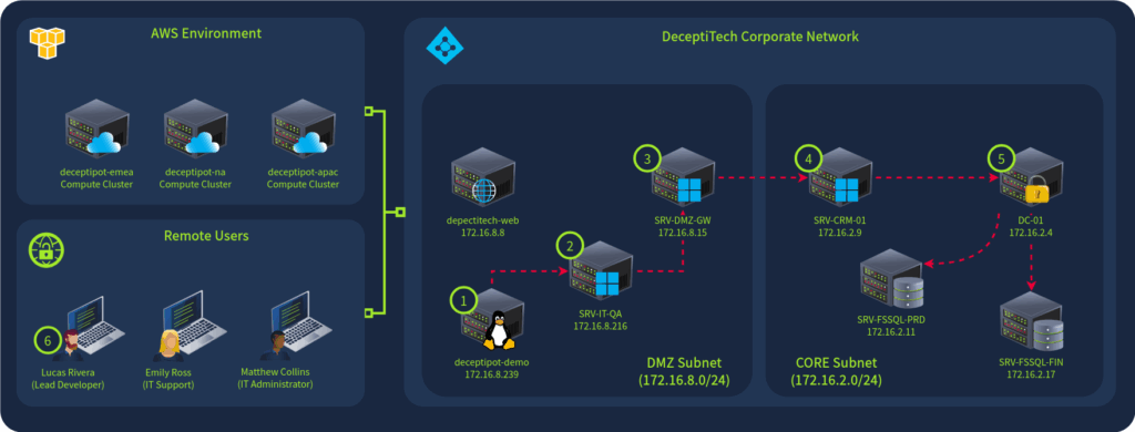 The internal DeceptiTech network is organized around a traditional on-premises Active Directory domain with approximately 50 active users. The product platform, however, is isolated and hosted entirely in the AWS cloud: